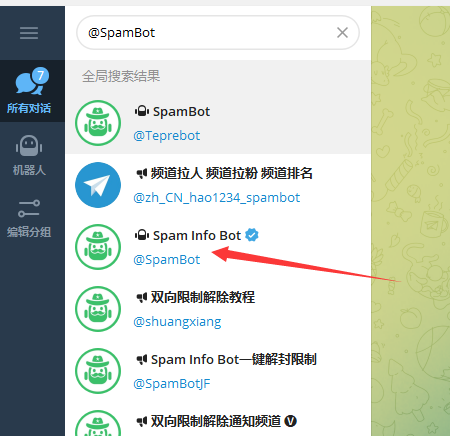 1、电报里面搜索框搜索“@SpamBot”,一定是红色箭头指向的那个,这个是官方专门用来处理这些事情的机器人。