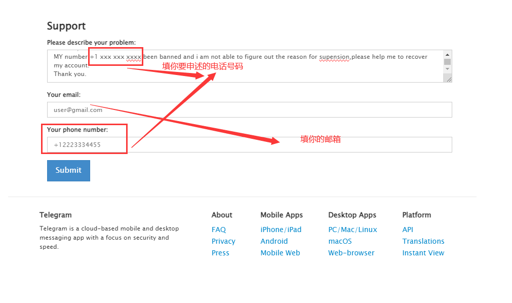 2、在页面里填入以下内容,如图所示填邮箱的地方输入你常用的邮箱,收解封邮件通知用的, xxx xxx xxxx 是填号码的地方一定要填你被封的那个手机号码,记得带上号码前的+1,不然无法解封